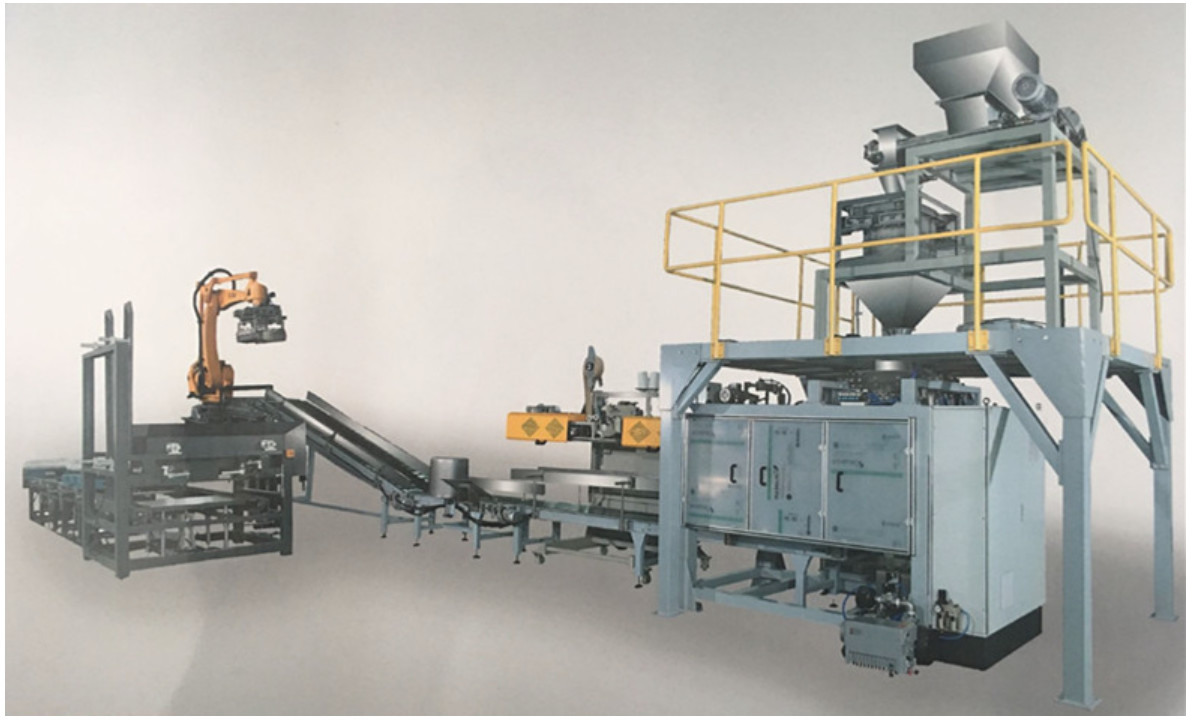Automatische gebende leere Tasche - automatisches Wiegen - automatische Füllung - automatische Nähmaschine - automatische Beförderung - Palettierungsc$stapeln des automatischen Roboters;